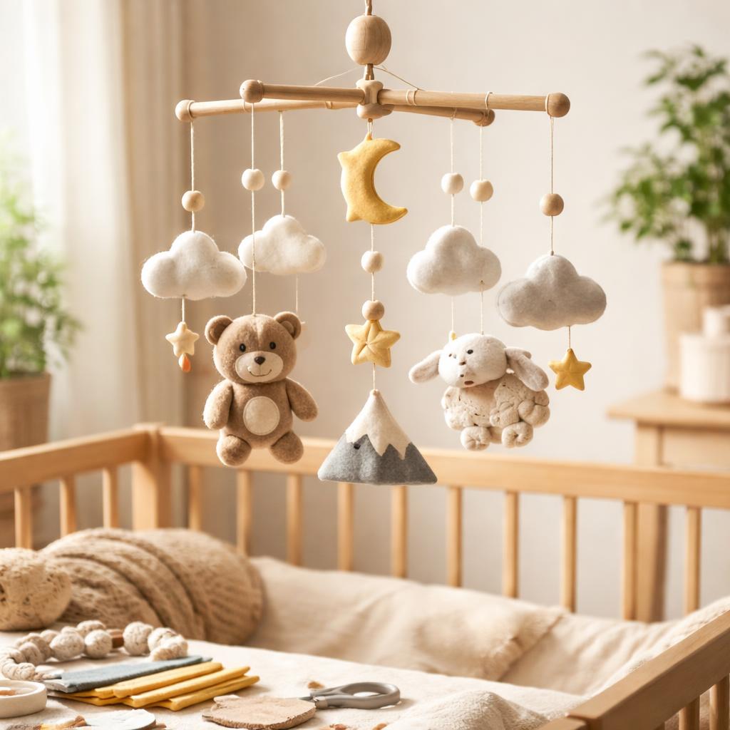 Le choix des matériaux oriente le style et la longévité de votre mobile. Le bois clair apporte une impression naturelle et durable ; la feutrine permet des formes douces et légères ; le tissu offre des motifs et des textures variées. Privilégiez des matières non traitées ou certifiées, faciles à nettoyer et agréables au toucher.